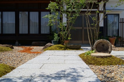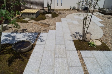 動線に配慮した植栽とアプローチのデザインです。苔のグリーン・川砂利・石畳のコントラストがとても綺麗です。