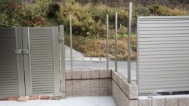 ブロック積と支柱の立て込みが終わり、セメントが固まってからフェンスの取り付けになります。
