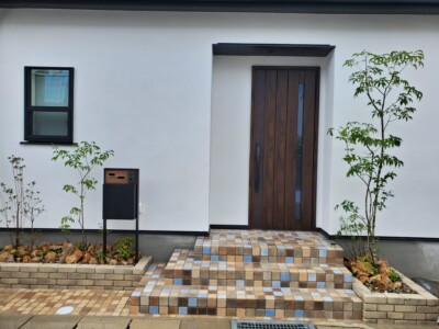 生活感も出ますし、爽やかで緑の葉がやさしい表情で柔らかな印象の玄関廻りとなりました。
