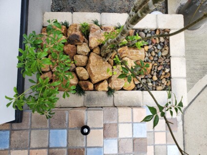 限られたスペースの中に小さ目の砂利を敷くことで奥行き感が出ます。