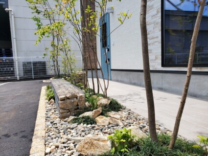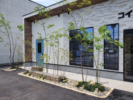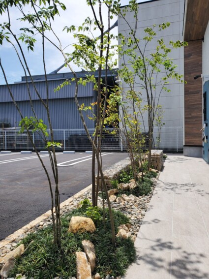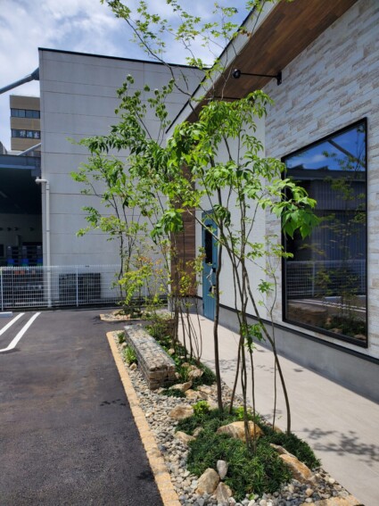 まるで違う場所に来たかのような雰囲気に仕上がった姫路市の店舗前の外構植栽工事です。