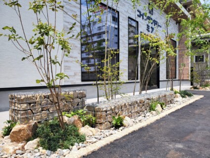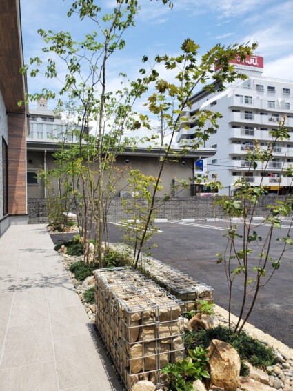 姫路市の店舗前ガーデンデザインガビオンと植栽のモダンでセンスいい庭