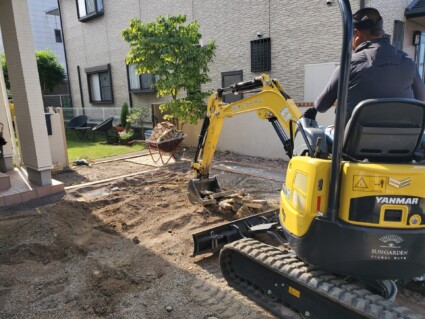 奥側の芝生の庭はそのまま残して、砂利のままだった駐車場部分にコンクリートやアプローチを仕上げていきます。