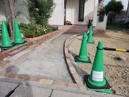 アプローチの部分と駐車場の部分はレンガで区切ります。