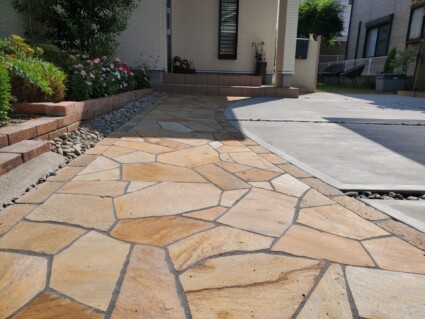 一つ一つ丁寧に貼られた乱形のアプローチは上質で品のある仕上がりとなっています。曲線を描いたデザインのアプローチは単調になりがちなアプローチによいアクセントとなり全体と調和したデザインです。