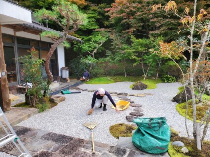 剪定や掃除を済ませると砂利を水平に均して砂紋をつけます。