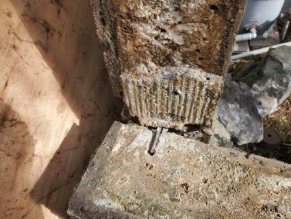 コーナー部分にもほとんど鉄筋がありませんし、大きな地震がくれば倒れると思います。