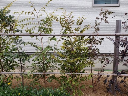 写真の生け垣は、斑入りのマサキ、ナンテン、トキワマンサク、アオダモ、シマトネリコ、モミジが並んでいます。