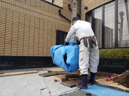 コンパネやシートで養生をして石貼り部分を傷つけないように工事を進めていきます。