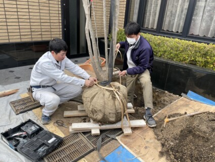 シンボルツリーに植えられていたハナミズキが枯れてしまったので、新しくヤマボウシを植えることになりました。