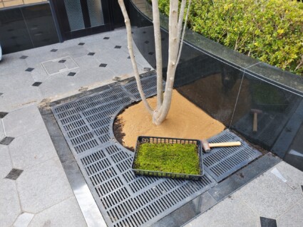 ハナミズキの枯れた植木を抜いて処分、そのあとに新しいシンボルツリーとしてヤマボウシの株立ち(約5.5m)を新たに植栽しました。