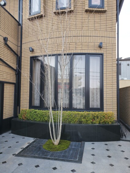 駐車スペースも兼ねている場所なので、可能な限りタイトで樹形のいいヤマボウシを選んで植栽しました。