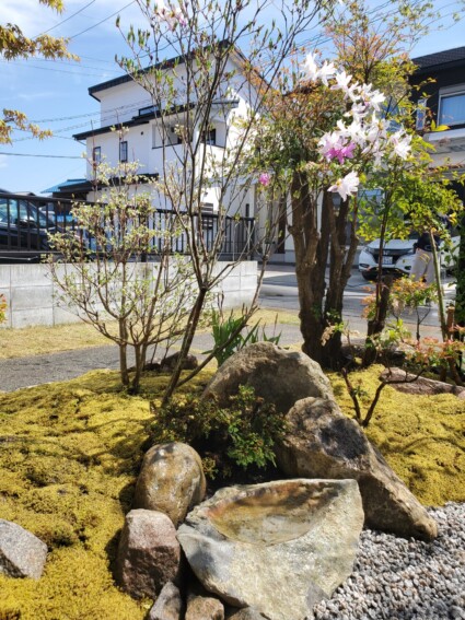 こんもりとした苔のグリーンに雑木の高さ具合が絶妙なバランスで雰囲気ある空間に仕上げています。