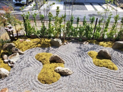こんもりとした苔のグリーンと砂紋の白川砂のコントラスト