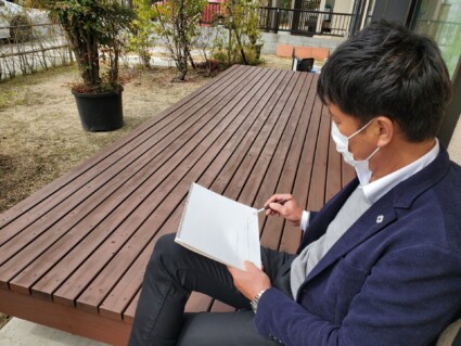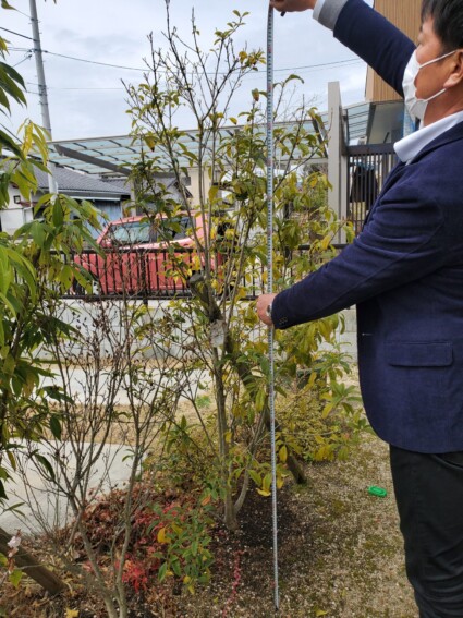 実際の現地に行き測量や既存の樹木などを確認しプランに反映していきます。