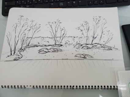 その場でデッサンしているガーデンデザイナーの田中です。