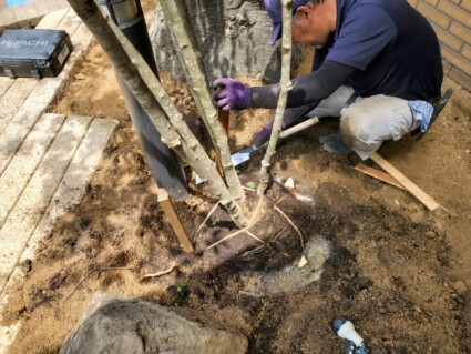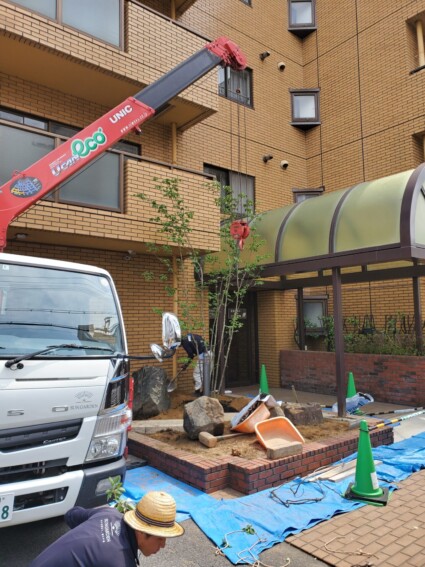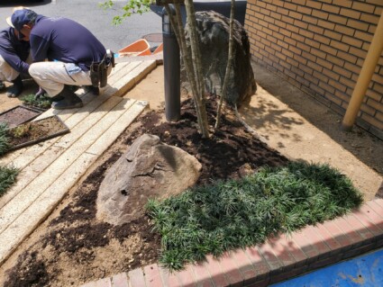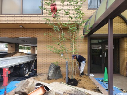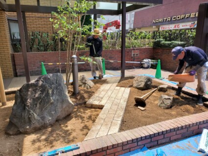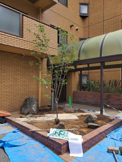 今日はカットしたノベ石でマンションの玄関前の」モダンなガーデンを造ります。