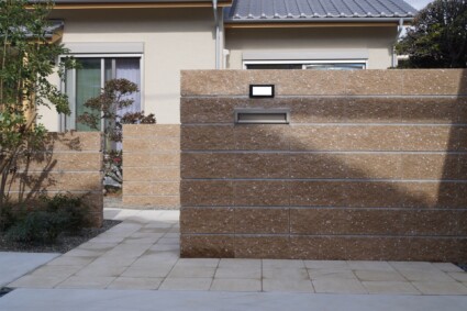高低差をつけた三つの門柱で、セミクローズにしあげました。プライバシーを確保するため、アプローチの奥にも同じ素材のブロックを設置しました。