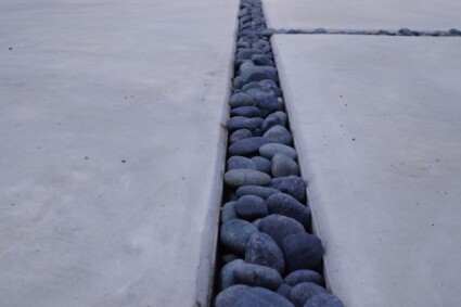 駐車場の土間コンクリートの目地には、那智黒石の化粧砂利を入れてアクセントにしました。