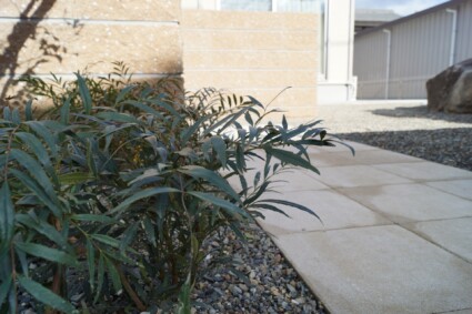 アプローチは、ユニソンベージュの平板を敷き詰めました。緩やかなスロープにすることで、バリアフリーにも配慮した施工となっています。