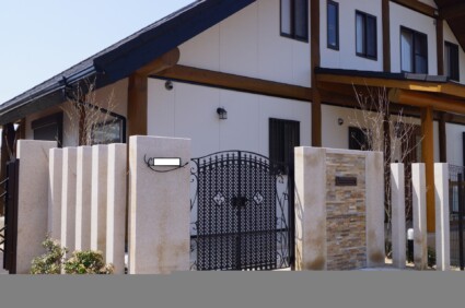 石の門柱は別注で創られました。高級感ある門柱には、アクセントでボーダーストーンを貼り合わせました。鋳物門扉を組み合わせることによって、重厚感のある門廻りが仕上がりました。