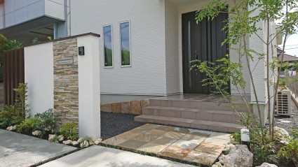 アプローチにはスクエアの自然石を使いました。全体的にナチュラル色でまとめていますが、一枚一枚の色合いが違うので、経年変化を楽しめるアプローチになりました。