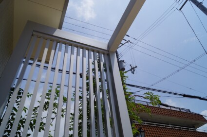 道路からの視線の目隠しも兼ね備えて、プラスGのフレーム格子を組み合わせました。ナチュラルシルバーの色味は、建物の外観との相性も良く、清潔感のある印象になりました。
