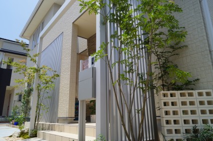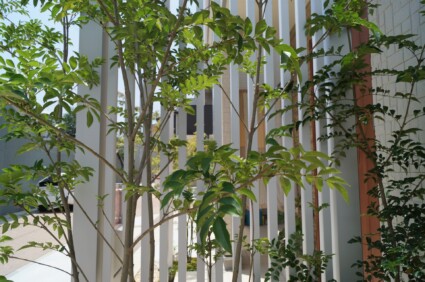 プラスGに絡めるように植栽したグリーンは、シンボルツリーとして人気のあるシマトネリコです。無機質な印象を与えがちな格子を、シマトネリコの植栽で柔らかさをプラスします。