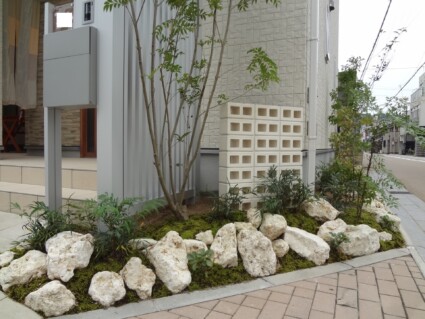 お客様のお気に入りの玄関前で、完成記念撮影です。グリーンが映える苔と、ホワイトカラーの空洞レンガとの色のコントラストが、お客様の一番のお気に入りだそうです!