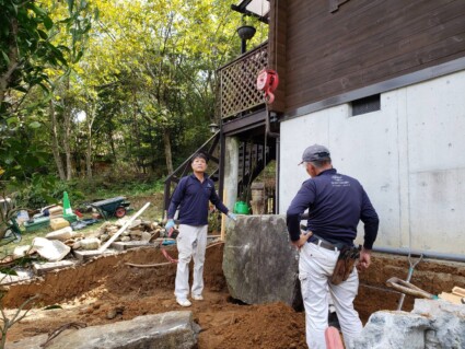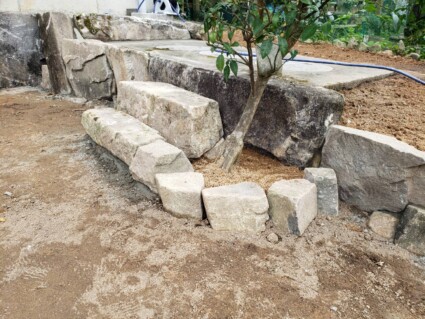 生野石で階段を作り、既存のユズの木の周り石で土留めをしています。