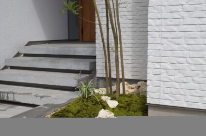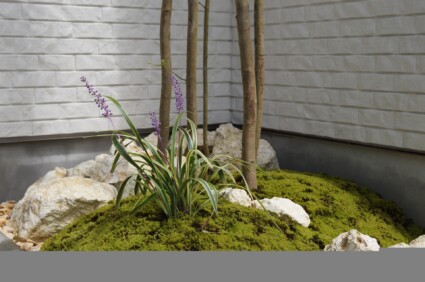 シンボルツリーのシマトネリコの足元には、琉球石と苔でデザインした小庭を設え、モダンな空間を演出しました。