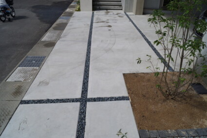 コンクリート目地に黒玉石を使用して、シンプルに仕上げた駐車場。直線ラインは駐停車する際のガイドラインとしての役割もあります。