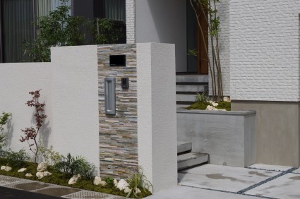 おしゃれな住宅の外観に合わせて、すっきりとしたシンプルな塗り壁門柱には、ボーダーラインをアクセントに配置。足元の植栽が、玄関廻りを引き立たせてくれます。