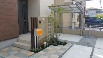 姫路市の新築外構工事着工後。アクセントカラーのオレンジポストがよく映えて、おしゃれ感が一気にUPします。シンボルツリーのシマトネリコとの色のバランスも良い素敵な門廻りし仕上がりました!