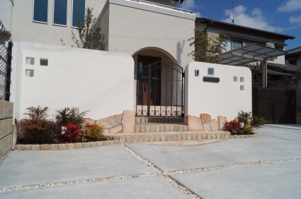 姫路市のかわいい塗り壁のある新築外構エクステリアデザイン