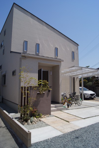 毎日の郵便物の取り入れが便利なように、門柱を玄関寄りに配置。門柱前にできたスペースを来客駐車用として活用することが出来ました!