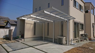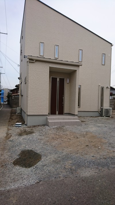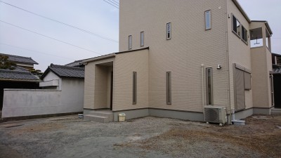 道路の全面が狭い為、セットバックした新築外構工事の完成です!後退させた部分は砕石を転圧させ、構造物は設置しておりません。