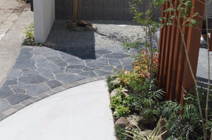 玄関に続くアプローチ。直線と曲線をバランス良く配置する事で、さらに素敵な空間が生まれます!限られた敷地をどれだけ活かせるか、また美しく演出できるかは全て外構で決まります!