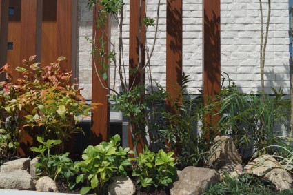 ウッド調の玄関ドアに合わせて、同色のアルミ角柱を7本、等間隔に配置することで、道路からの視線を遮ります。アルミ角柱だけでは殺風景になりがちなので、足元に低木や下草などの緑を入れ、より自然に仕上げていきます。