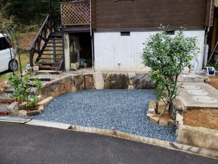 建物前のスペースを駐車場に変えます。広くてスッキリした場所にするために不要な木は切ってしまいます。