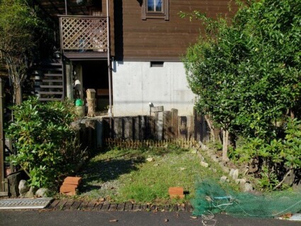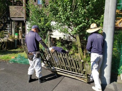 お庭を囲っている柵を撤去します。柵にはネットや紐が絡まっているので残す部分まで壊さないように注意します。柵は枕木に固定されているので少しずつはがしていきます。