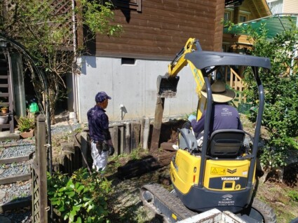 枕木は短いものは手で動かして運び出します。見た目は短くても深くまで埋まっている長いものは、重さもあるのでユンボを使って掘り起こしていきます。