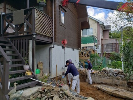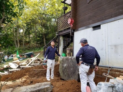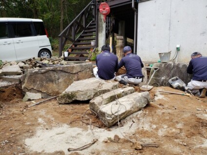 作業場所が建物に近いので、石や道具が建物に当たらないように慎重に作業します。