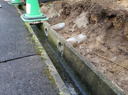 建物に沿って雨水のパイプが通っていたので、石をパイプに当たらない位置で、できるだけ建物側に寄せて駐車場の広さを確保します。