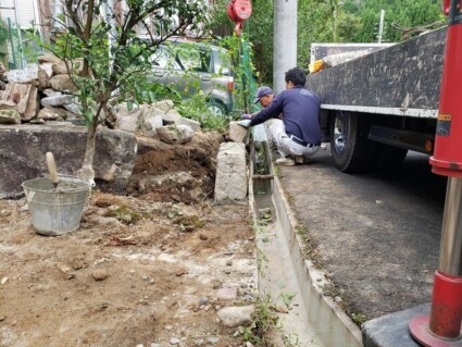 道路側に並べる石はそれほど大きさがなく重さもありません。石の裏側に土を戻したときに土の重みで倒れる可能性があります。倒れないように石の周りにモルタルを入れてしっかりと固定します。