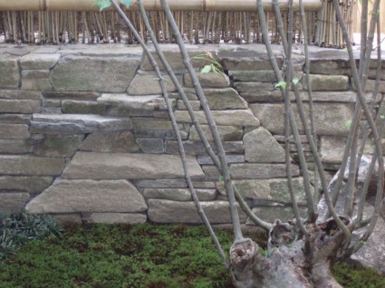 高さの異なる2枚の竹垣で奥行きを出し、あられこぼしの通路に石貼りを施しました。