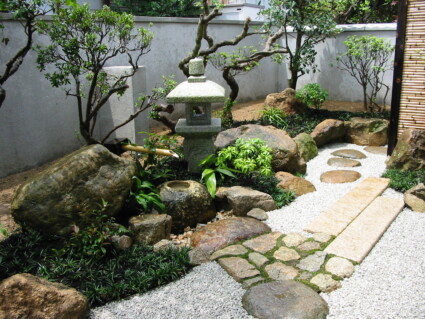 つくばいと灯篭のある風情あふれる和風庭園