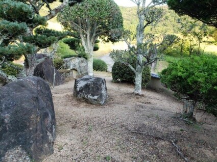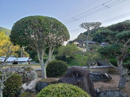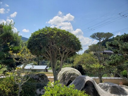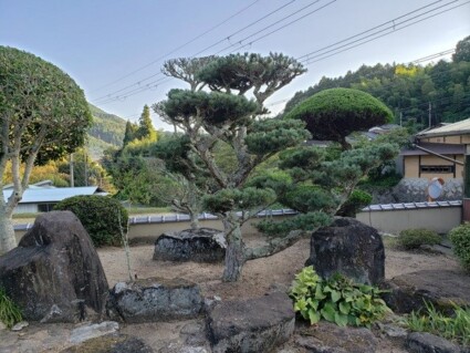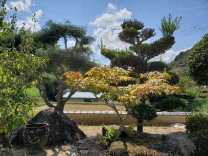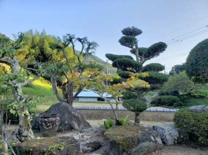 刈り込んでいない左側のスイリュウヒバや手前のモミジは、枝が伸びてもそれほど違和感がない場合もあります。