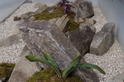 こちらの石組は「根張り」と呼ばれ、石を一定方向に組み合わせる石使いです。根張りと呼ばれる動きをつけた石組に、オモトやイワナンテンや砂苔で築山を設け、趣のあるお庭に仕上げました。