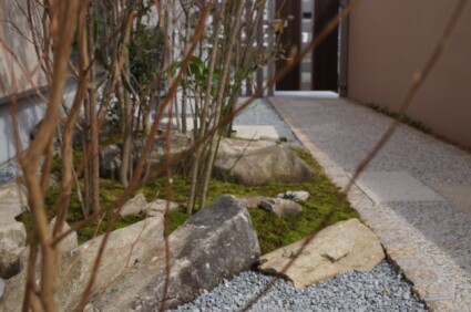 雑木の足元に据えられた石は、生野石の天然石で石本来の重厚感や趣を感じることができます。経年変化で、「寂び」といわれる味わい深い表情を出してくれる和の素材です。